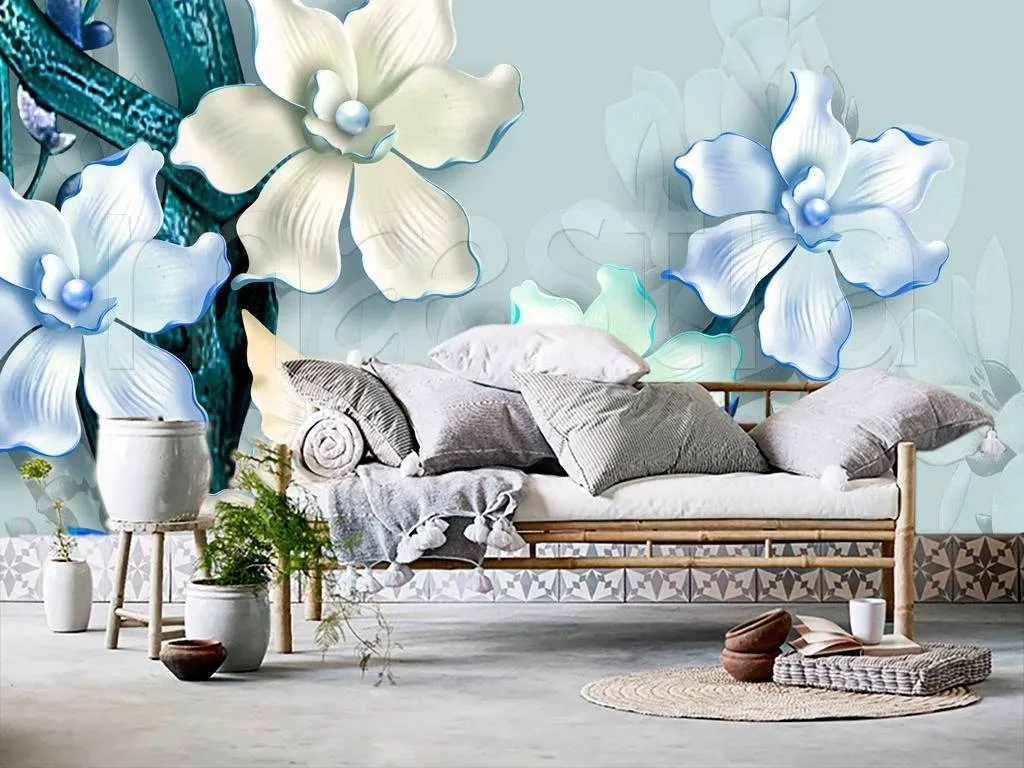Бесшовные обои на стену: 3д цветы синие. Артикул: 10-565