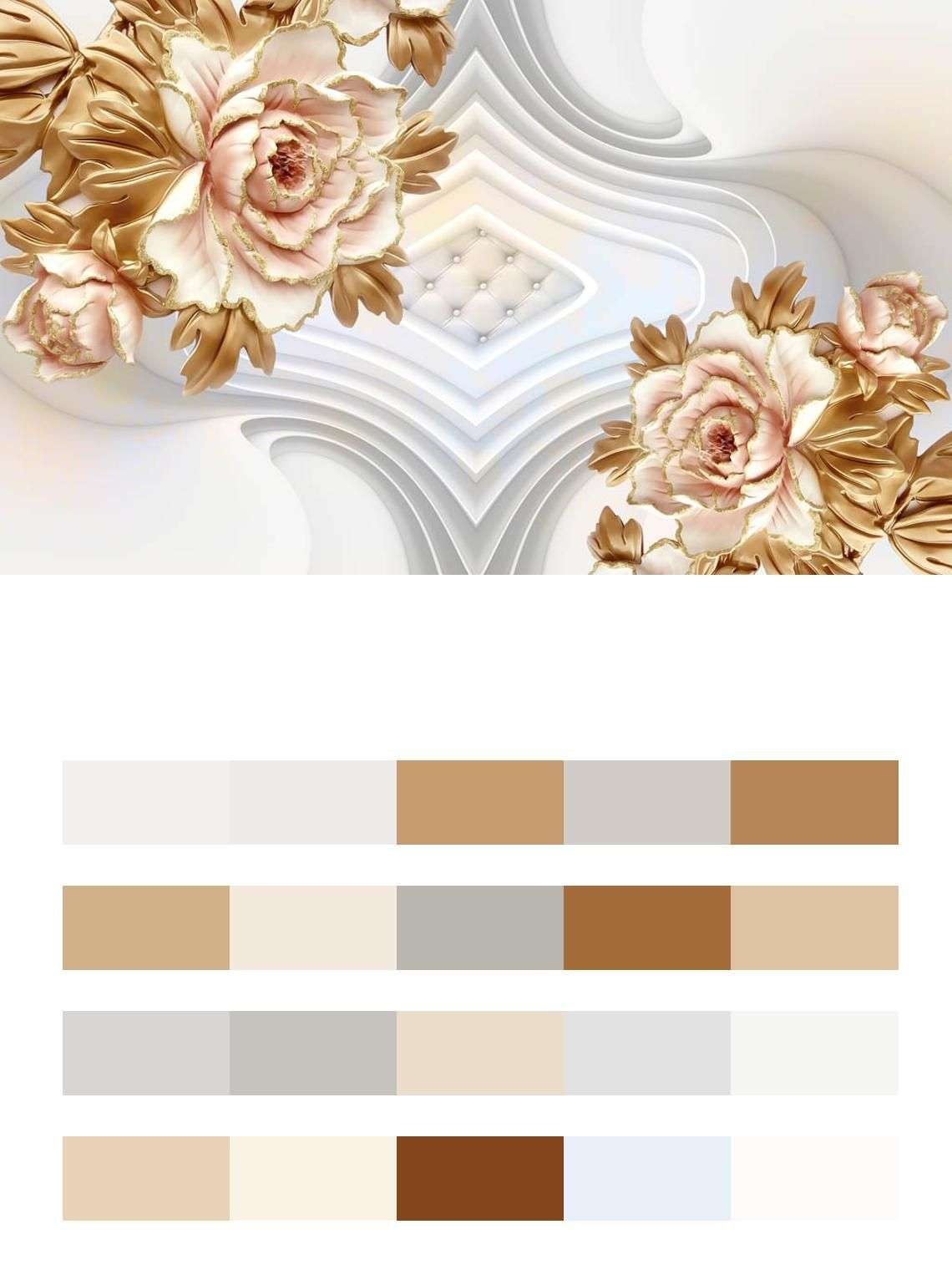 Бесшовные обои на стену: 3д Объемные золотые цветы. Артикул: 10-926
