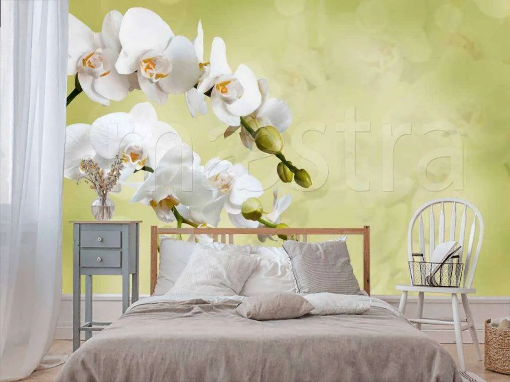Бесшовные обои на стену: Белая орхидея на светло зеленом фоне. Артикул: 10-168