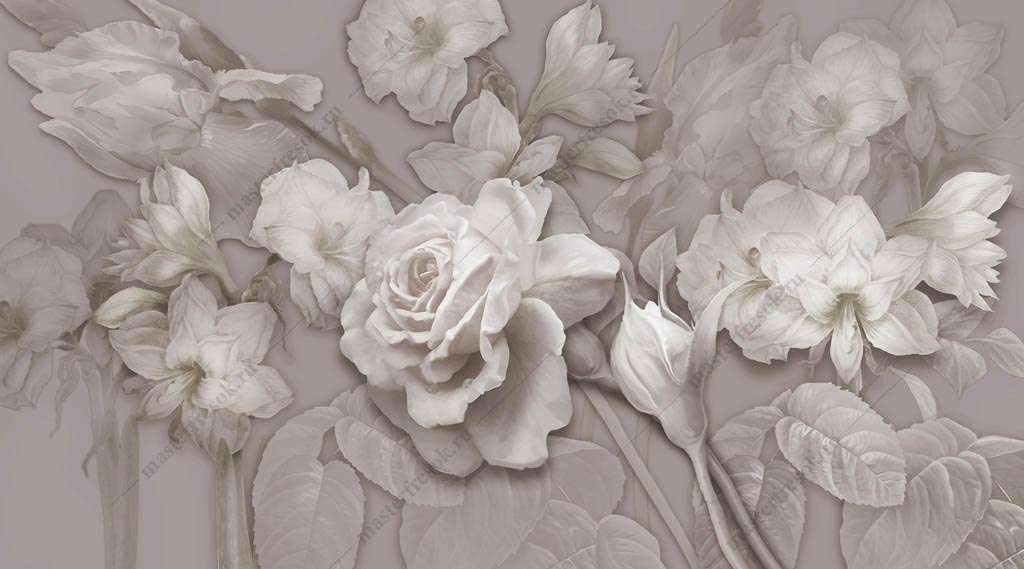 Бесшовные обои на стену: 3д цветы на бежевом фоне. Артикул: 13-349
