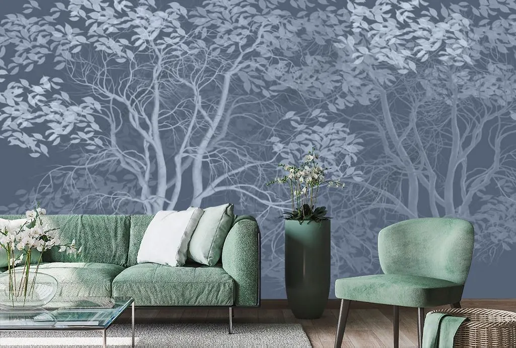 Бесшовные обои на стену: Белые деревья на синем фоне. Артикул: 13-358