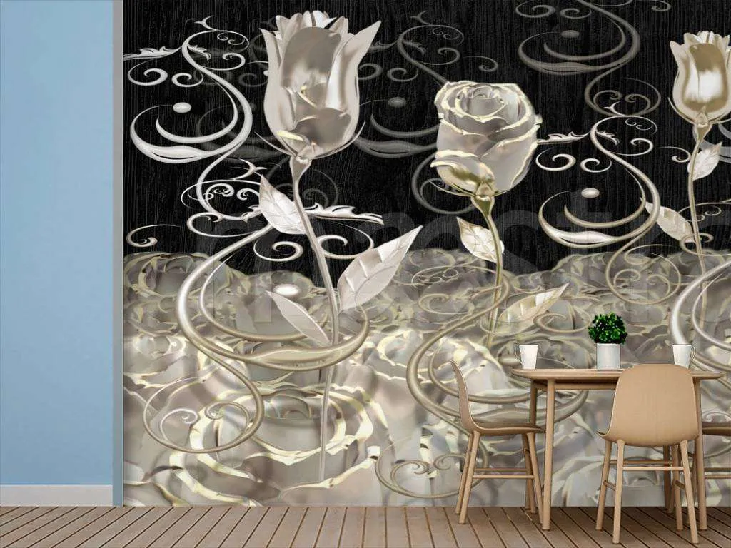 Бесшовные обои на стену: Розы с золотыми узорами. Артикул: 7-592